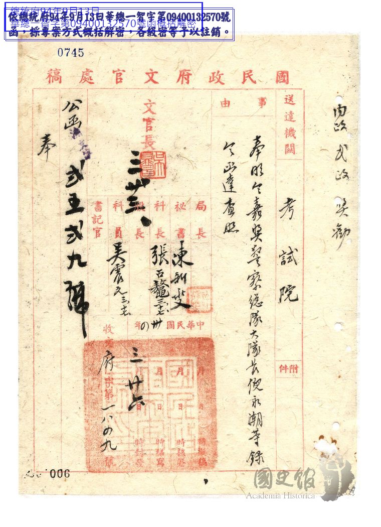 國民政府文官處函考試院為奉明令嘉獎警察總隊大隊長倪永潮等錄令函達查照