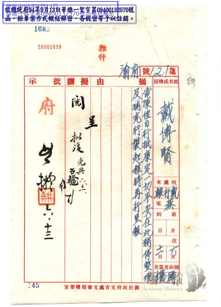 考試院長戴傳賢電國民政府主席林森為行抵康定一切平安