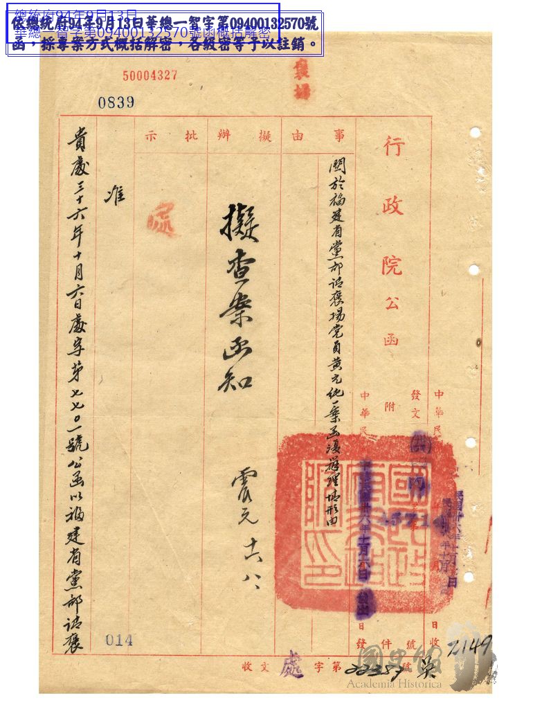 行政院長張羣函國民政府文官處為函復福建省黨部請褒揚黨員黃元純一案辦理情形請查照轉陳