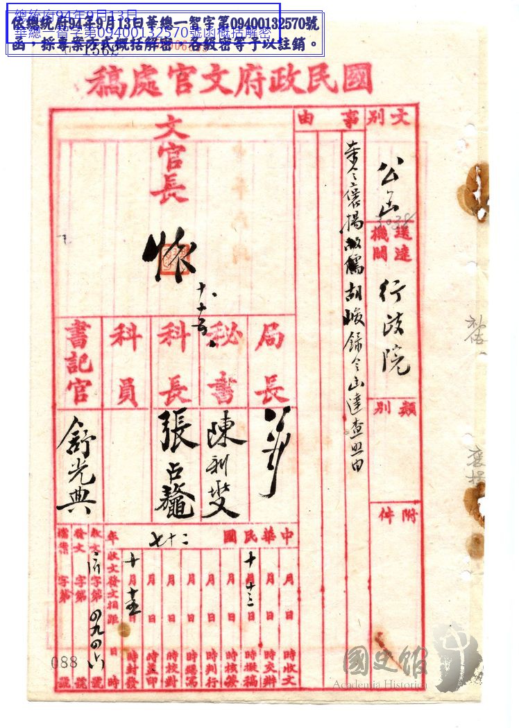 國民政府文官處函行政院為奉令褒揚胡峻錄令函達查照