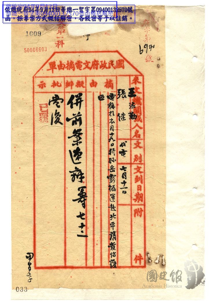 王法勤及張繼電國民政府為七月十九日將孫岳靈柩運赴北平請發給護照並飭沿途地方官妥為照料