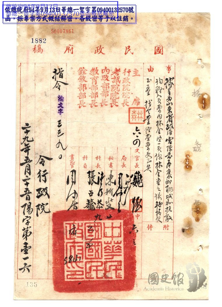 國民政府指令行政院據山東省政府呈為前奉褒卹山東聊城抗敵殉職人員案內林金堅係林金堂之誤轉請更正一案業經查案更正