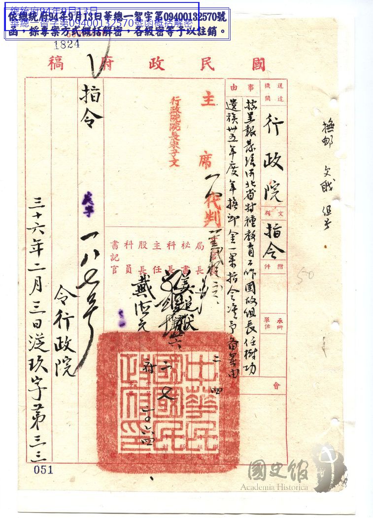 國民政府指令行政院據呈報發給任樹功遺族三十五年度年撫卹金請鑒核備案一案指令准予備案