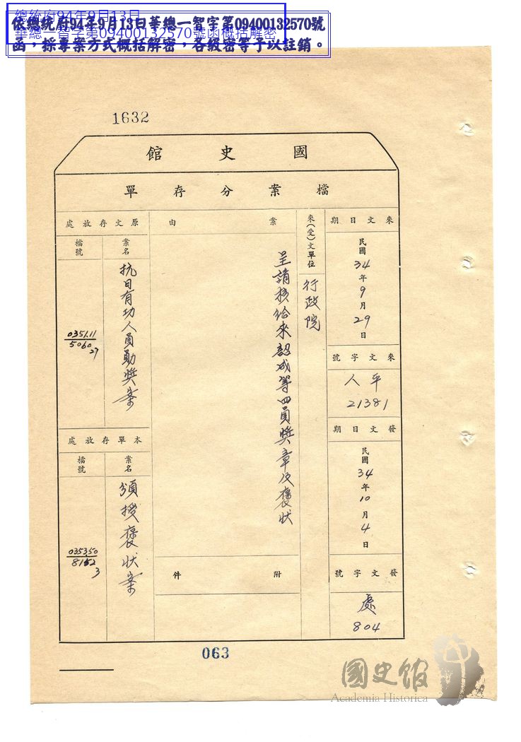 行政院呈請核給來韶成等四員獎章及褒狀案分存單