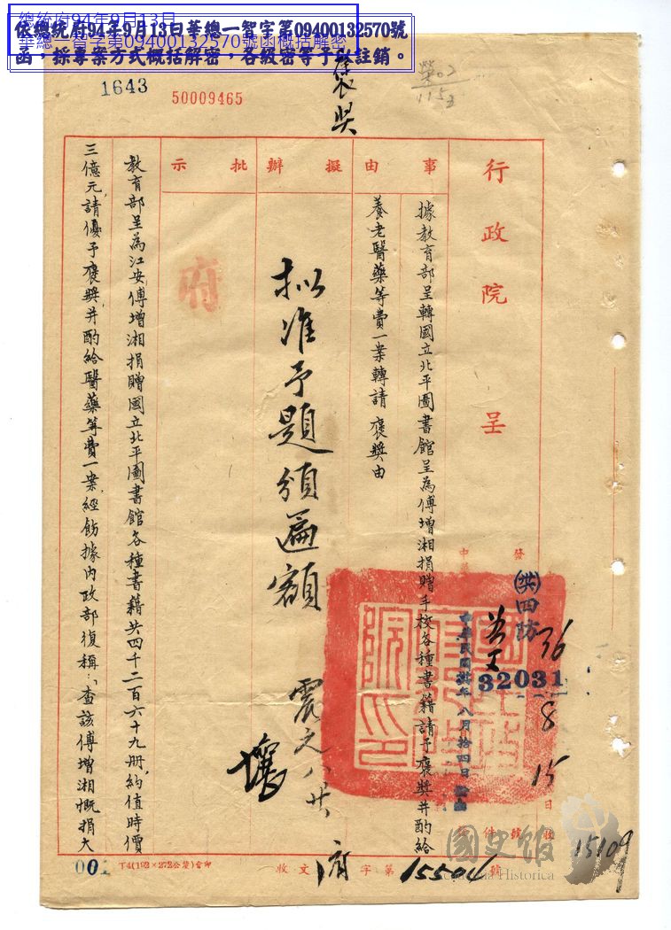 行政院院長張羣呈國民政府主席蔣中正為傅增湘捐贈書籍請予褒揚獎勵題頒匾額並酌給養老醫藥等費