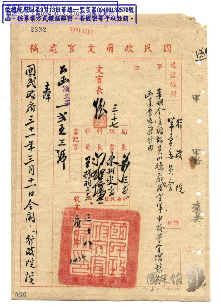 國民政府文官處函行政院等為奉明令追贈故員山德爾等六員為空軍中校等官階錄令函達查照轉行