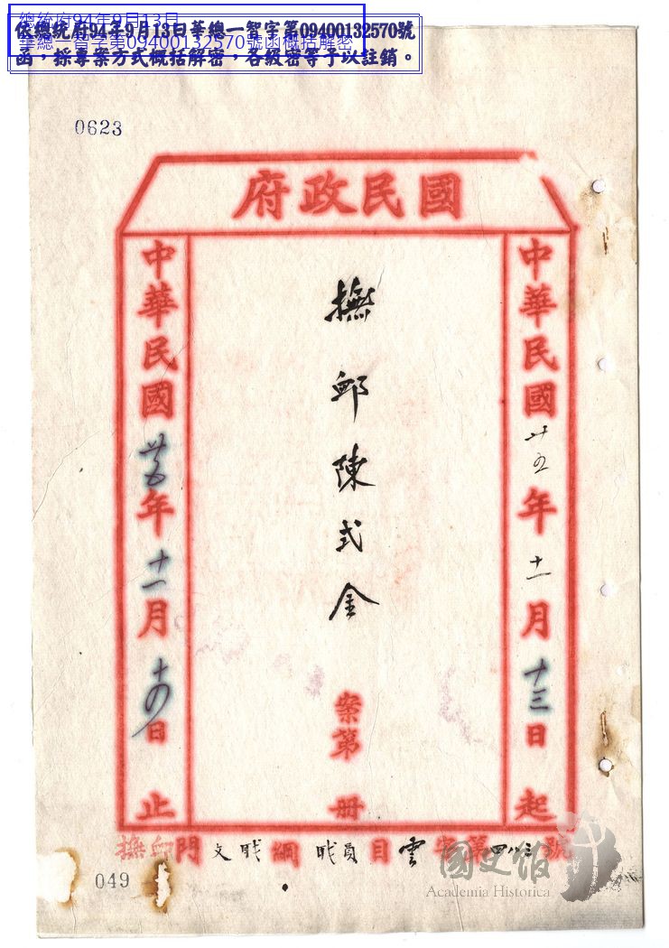行政院院長蔣中正呈國民政府主席林森為發給國立北京大學退職職員陳式金養老金請鑒核備案