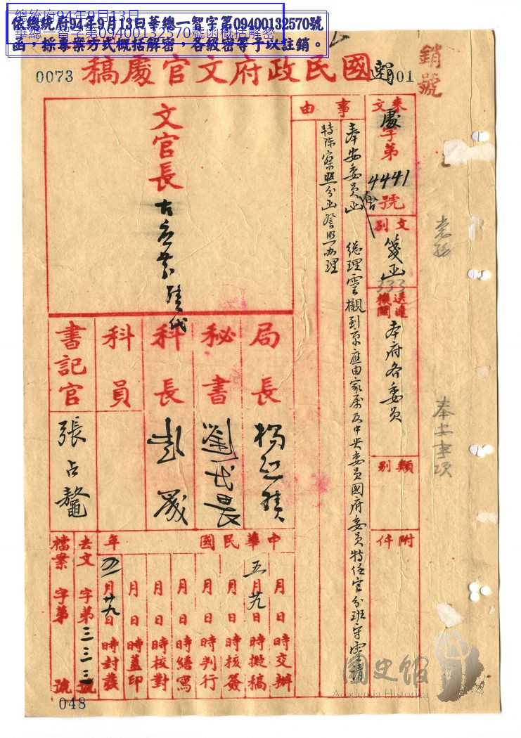 國民政府文官處函國府各委員為總理奉安委員會函為總理靈櫬到京應由家屬及中央委員國府委員特任官分班守靈分函察照辦理