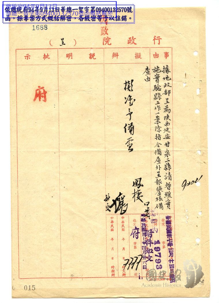 行政院院長張羣呈國民政府主席蔣中正據地政部呈為陝西省延安甘泉二縣請暫緩實驗縣工作一案除指令備查外呈報鑒核備查