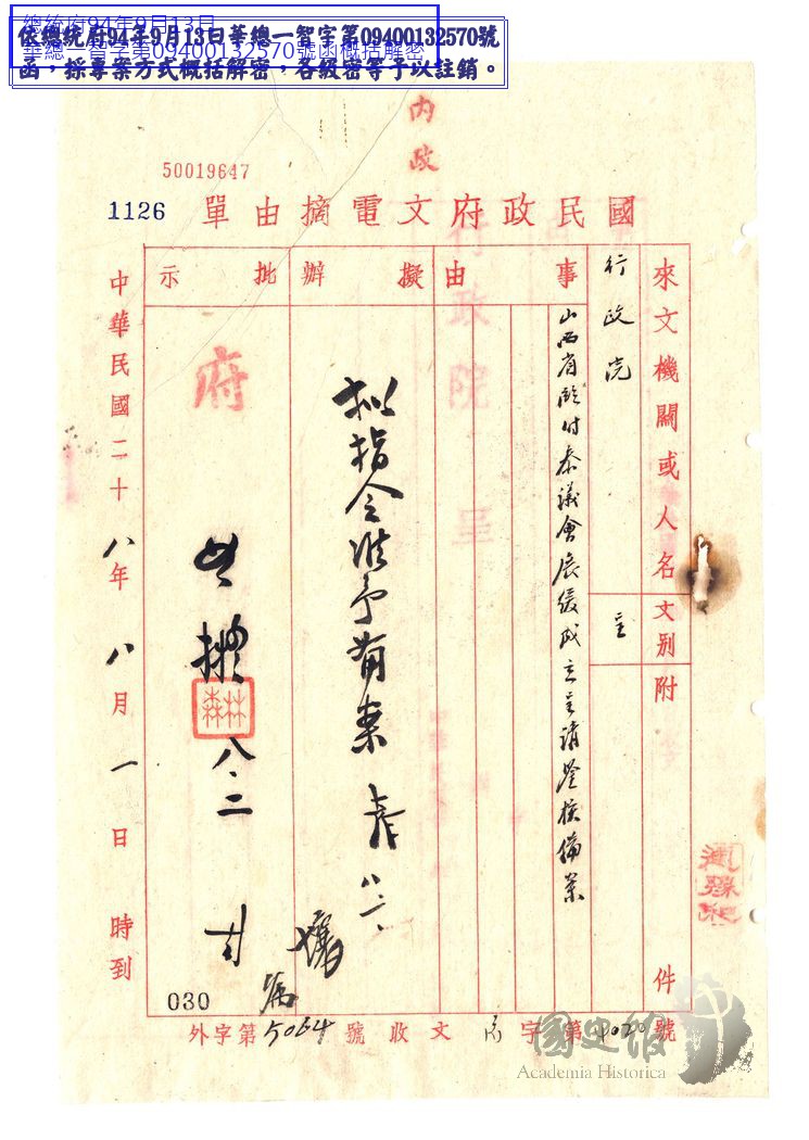 行政院院長孔祥熙呈國民政府為山西省臨時參議會展緩成立呈請鑒核備案