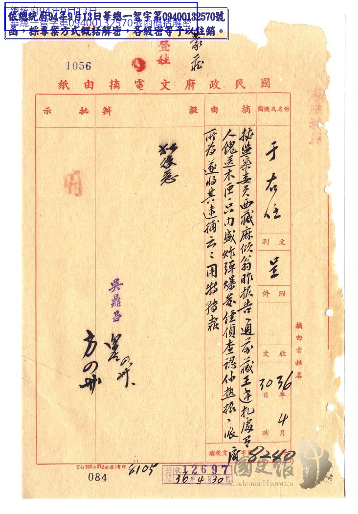 監察院長于右任呈國民政府主席蔣中正為轉陳麻傾翁報告藏王達札處爆炸經查係熱振所為遂將其逮捕