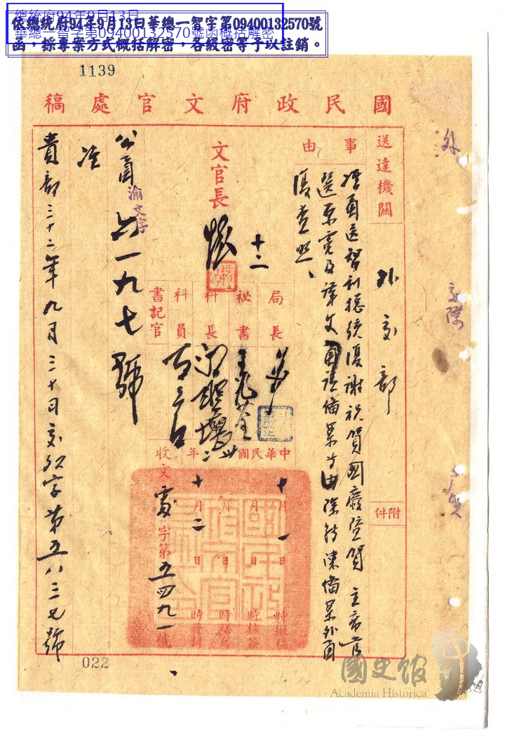 國民政府文官處函外交部為准函送智利總統復謝致賀國慶原電及譯文等由除轉陳備案外函復查照
