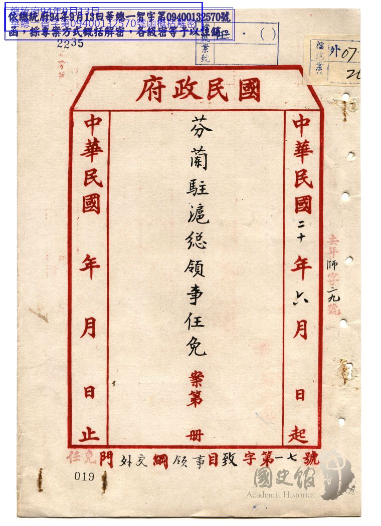 外交部函國民政府文官處為函送芬蘭駐上海總領事諾林領事證書請簽署蓋璽發還