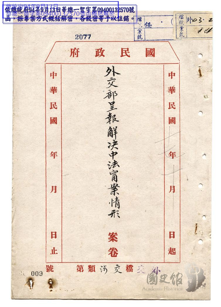 外交部部長王正廷呈國民政府為呈報中法解決寧案情形請鑒核備案