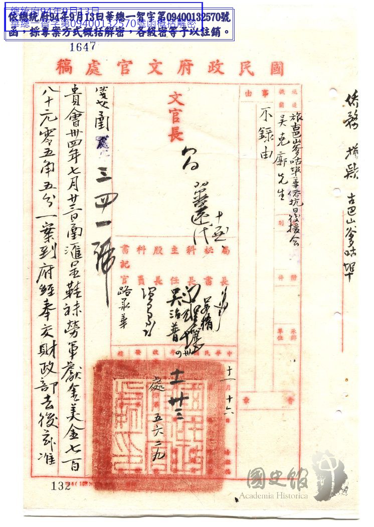 國民政府文官處函旅古巴山爹咕埠華僑抗日後援分會吳克廓為三十四年七七鞋襪捐款業已照收並奉諭嘉勉