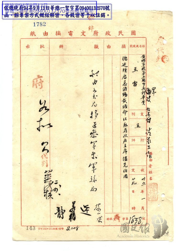王雷呈國民政府為懇賜栽培命江蘇省政府主席儘先任用