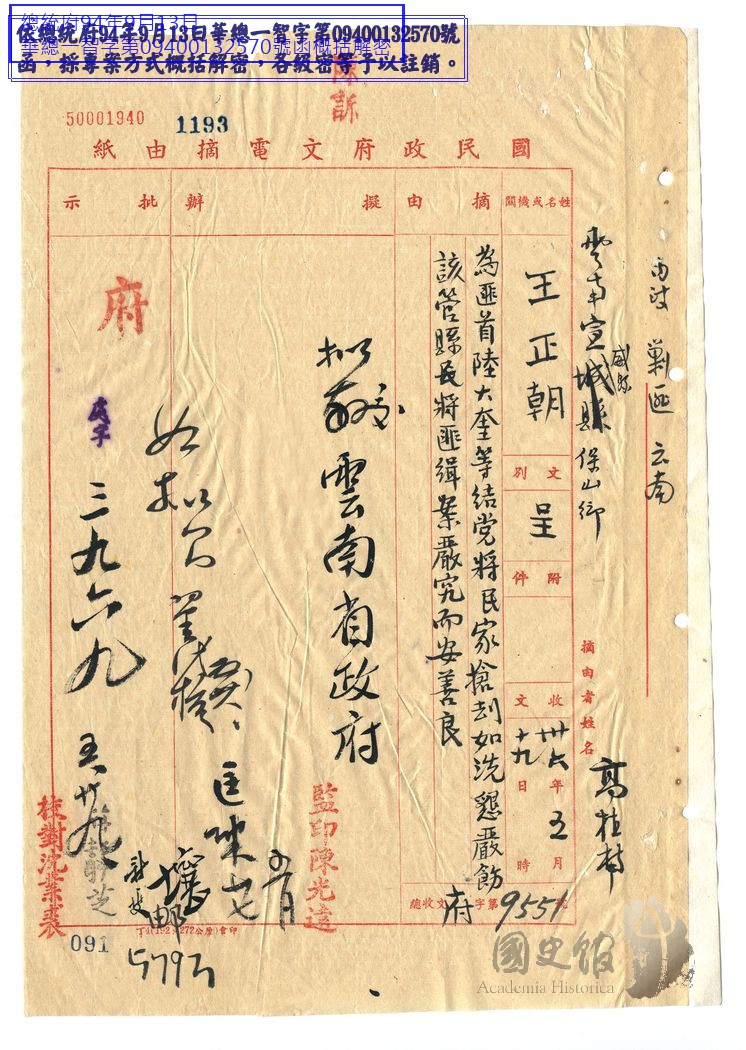 王正朝呈國民政府主席蔣中正為匪首陸大奎等結黨搶劫民眾懇飭縣長將匪緝案嚴究而安善良
