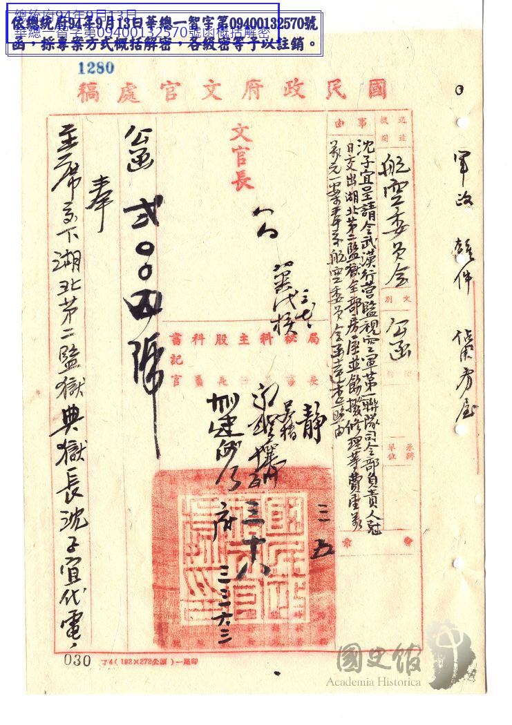 國民政府文官處函航空委員會為辦理請令空軍第一聯隊剋日將湖北監獄房舍交出案奉諭交航空委員會
