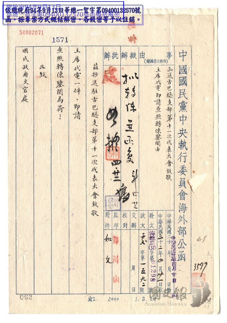 中國國民黨中央執行委員會海外部部長劉維熾函國民政府文官處為抄送古巴總支部致敬勞軍電請轉陳