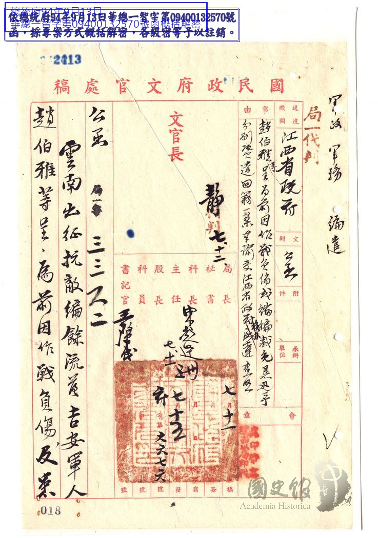 國民政府文官處函江西省政府為趙伯雅等前因作戰負傷懇分別資遣回籍案奉諭交江西省政府核辦