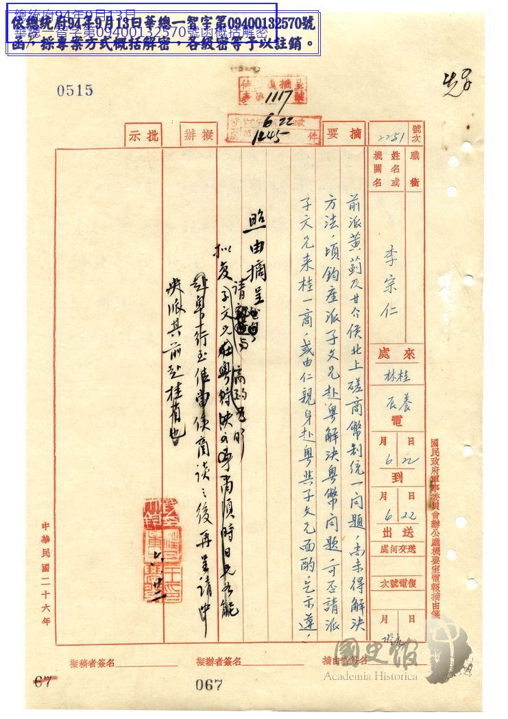 李宗仁電呈軍事委員會委員長蔣中正為請派宋子文來廣西或由仁親赴廣東與其面酌幣制統一問題