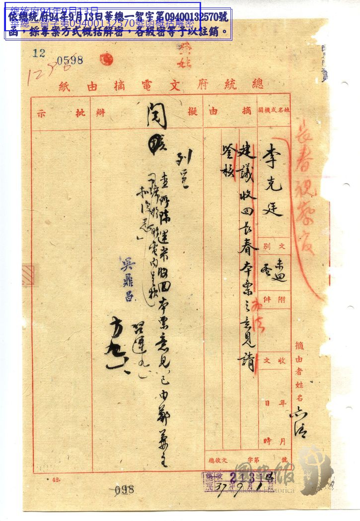 長春視察官李克廷電呈中華民國總統蔣中正為建議收回長春本票辦法