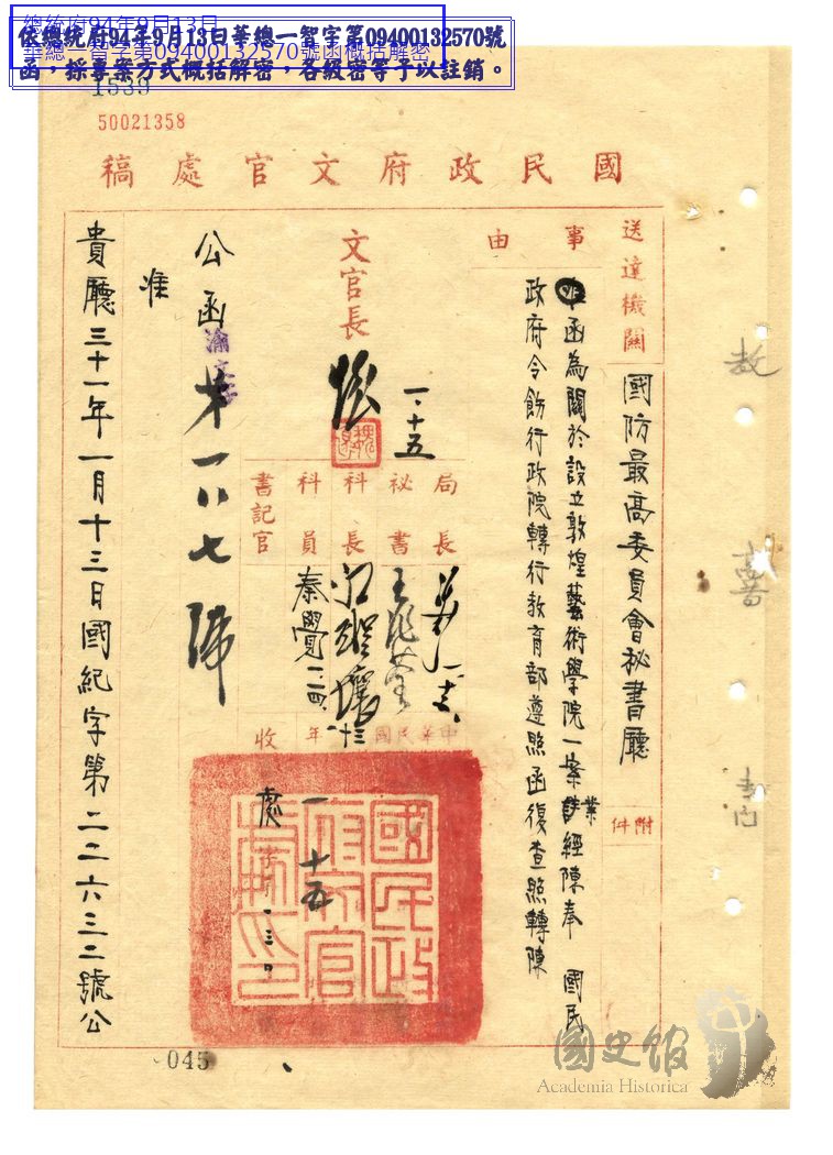 國民政府文官處函國防最高委員會秘書廳有關委員于右任提議設立敦煌藝術學院一案業經令飭行政院轉行飭教育部遵照