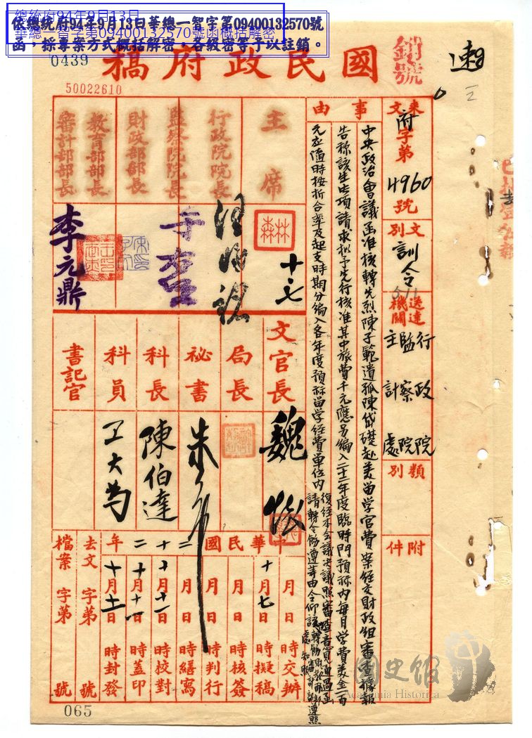 國民政府訓令行政院監察院本府主計處有關中國國民黨中央政治會議函准核轉先烈陳子範遺孤陳岱礎留學官費案經決議照財政組經費審查意見通過令仰轉飭財政部遵照