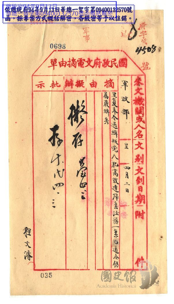 軍政部部長馮玉祥呈國民政府為呈復奉令通緝叛黨人犯高效達歸案法辦一案已通令飭屬嚴緝