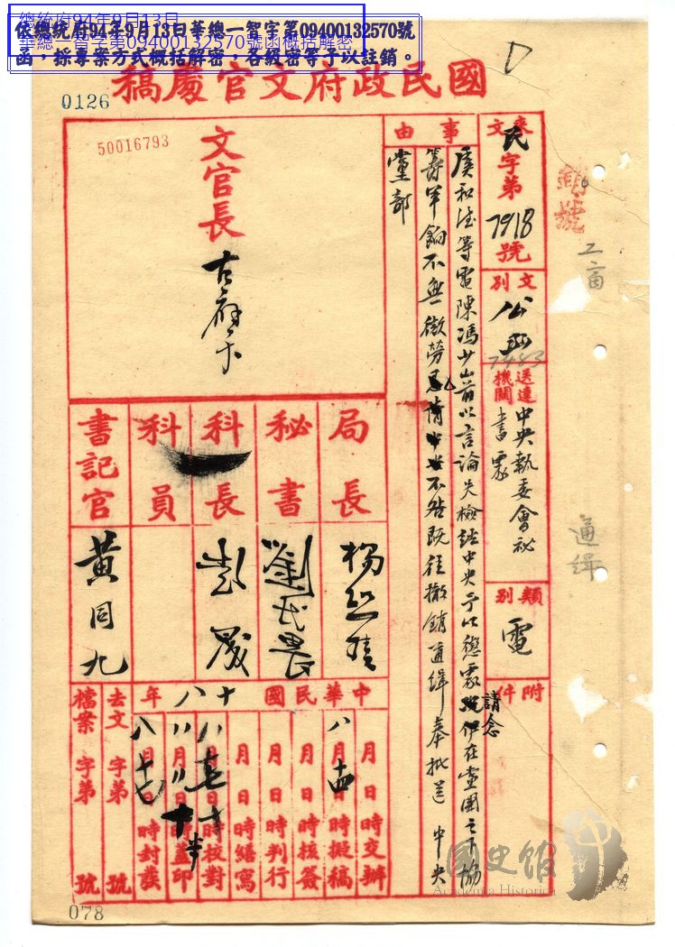 國民政府文官處函中國國民黨中央執行委員會秘書處關於虞和德等電陳馮少山在黨國之下協籌軍餉不無微勞懇請中央不咎既往撤銷通緝以示寬大一案奉批送中央黨部