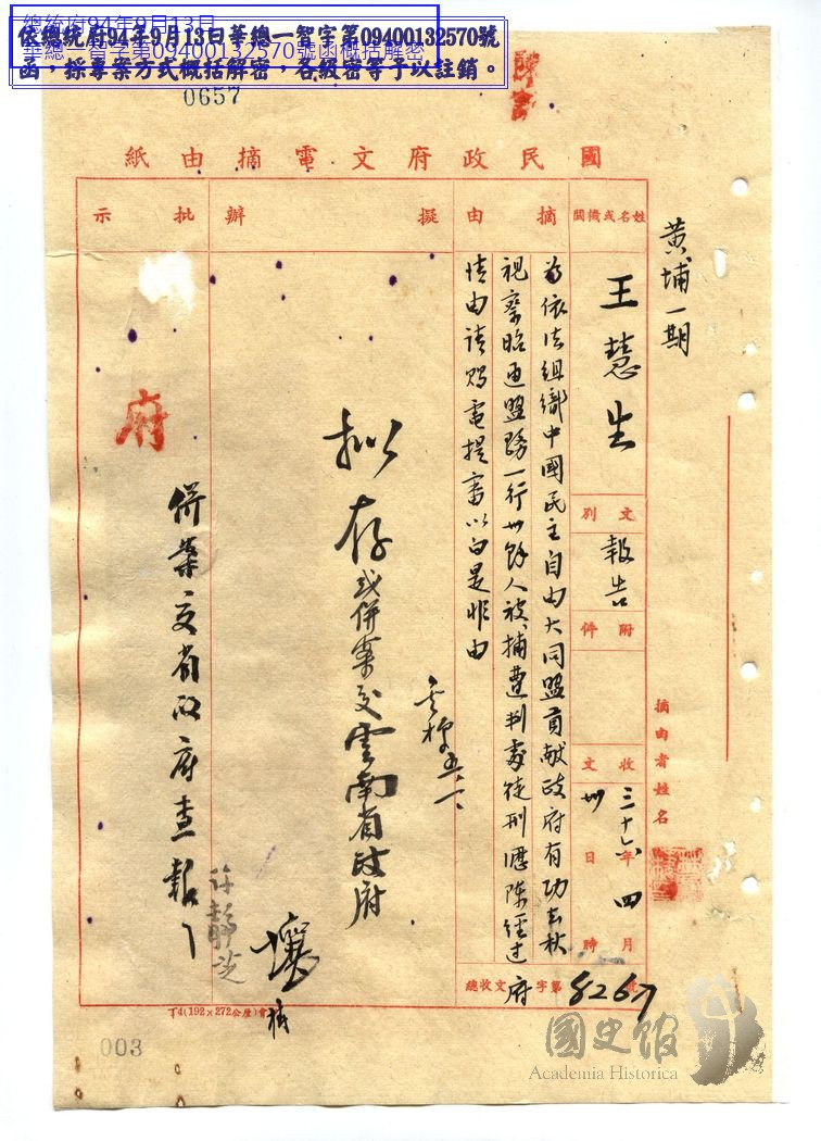 王慧生呈國民政府主席蔣中正為依法組織中國民主自由大同盟貢獻政府有功反被捕遭判徒刑請賜電提審