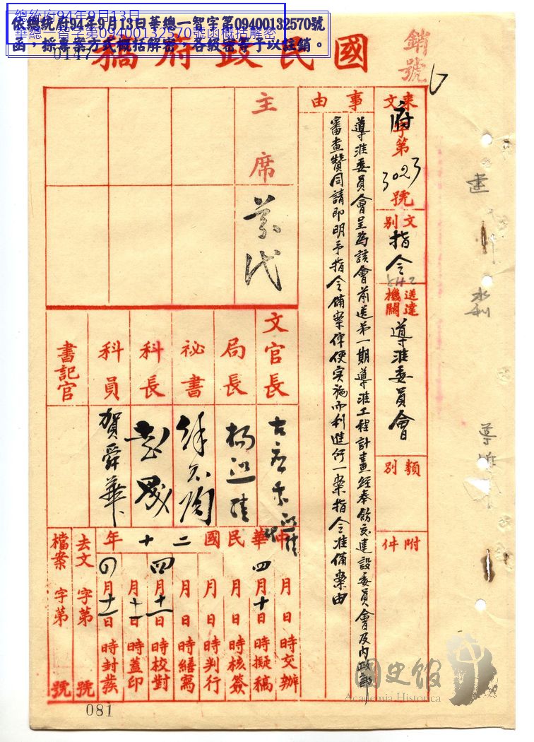 國民政府指令導淮委員會為第一期導淮工程計劃准予備案