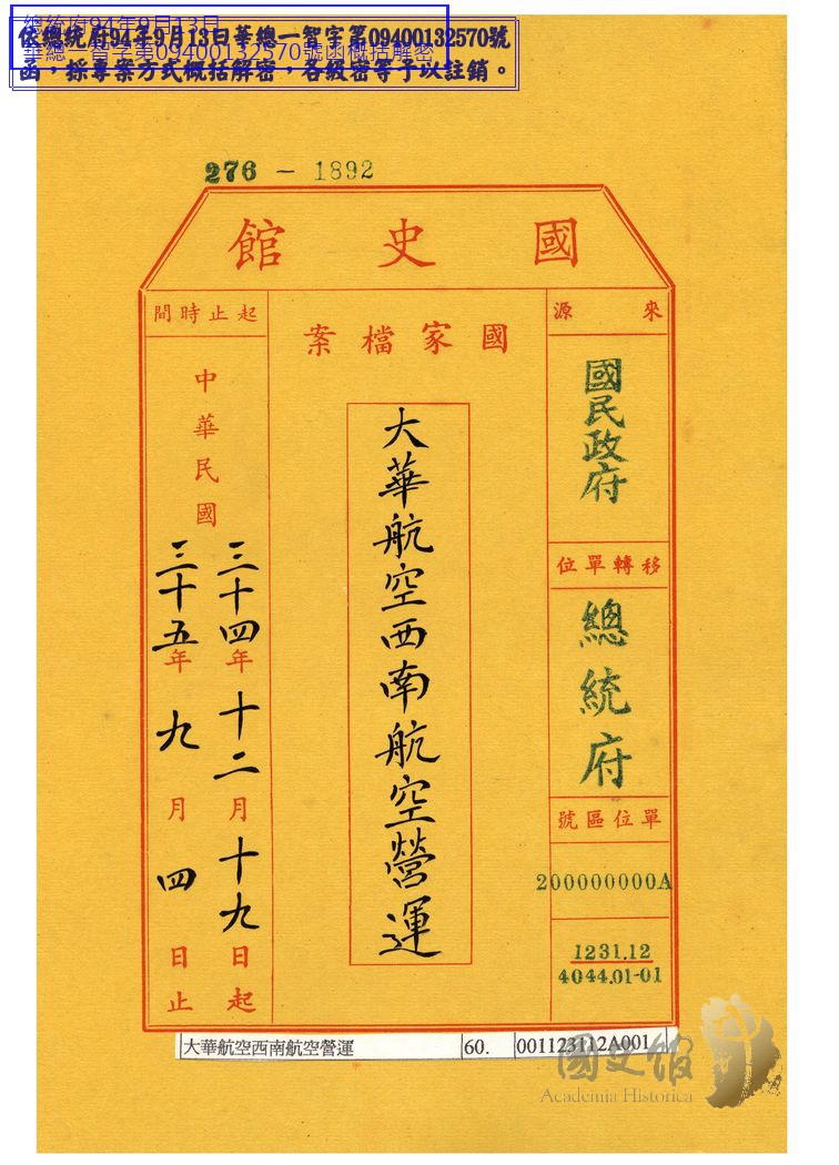 大華航空公司呈送大華航空公司成立經過報告書請准予試辦開航及該案無庸置議等情,行政院呈擬西南航空公司恢復經營