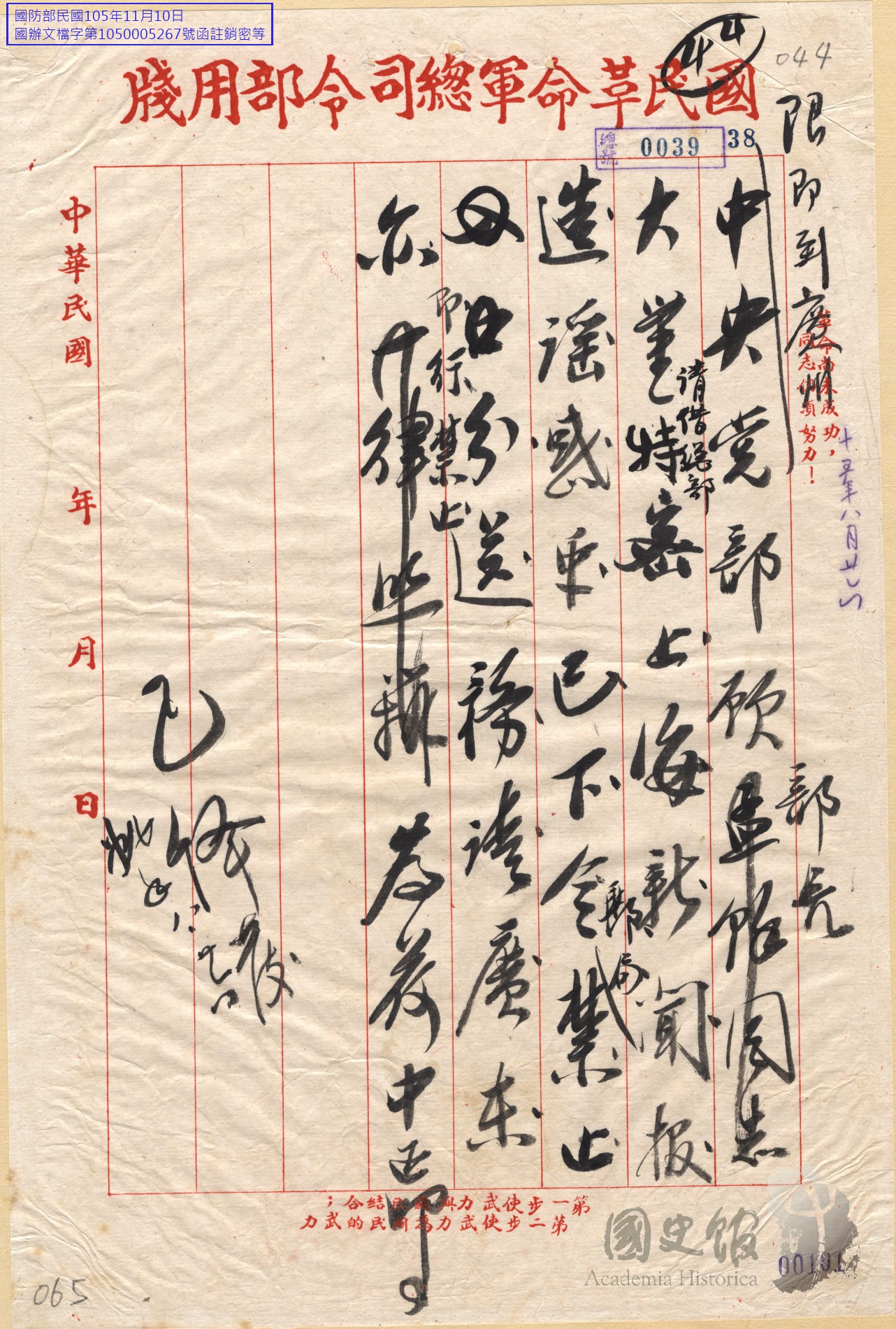 蔣中正電中央黨部顧孟餘上海新聞報造謠惑眾已下令郵局禁送請廣東照辦