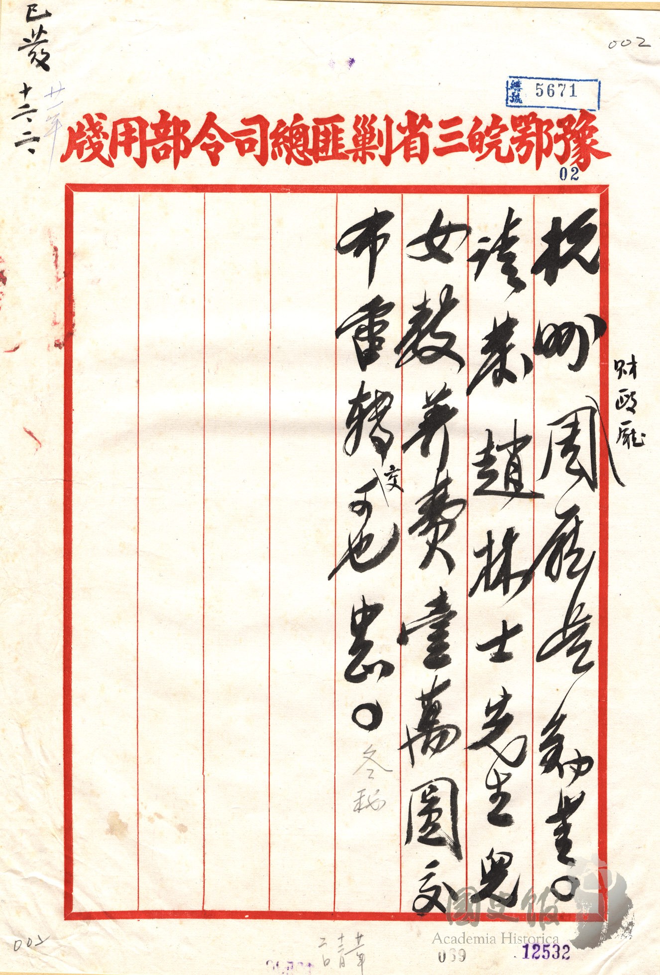 蔣中正電囑周駿彥發趙林士兒女教養費壹萬元由陳布雷轉交