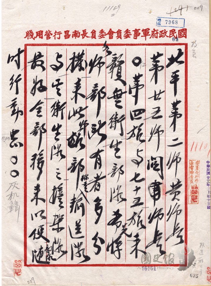蔣中正電令黃杰關麟徵各師部衛生部隊擔架及輜重輸送隊移撥來贛
