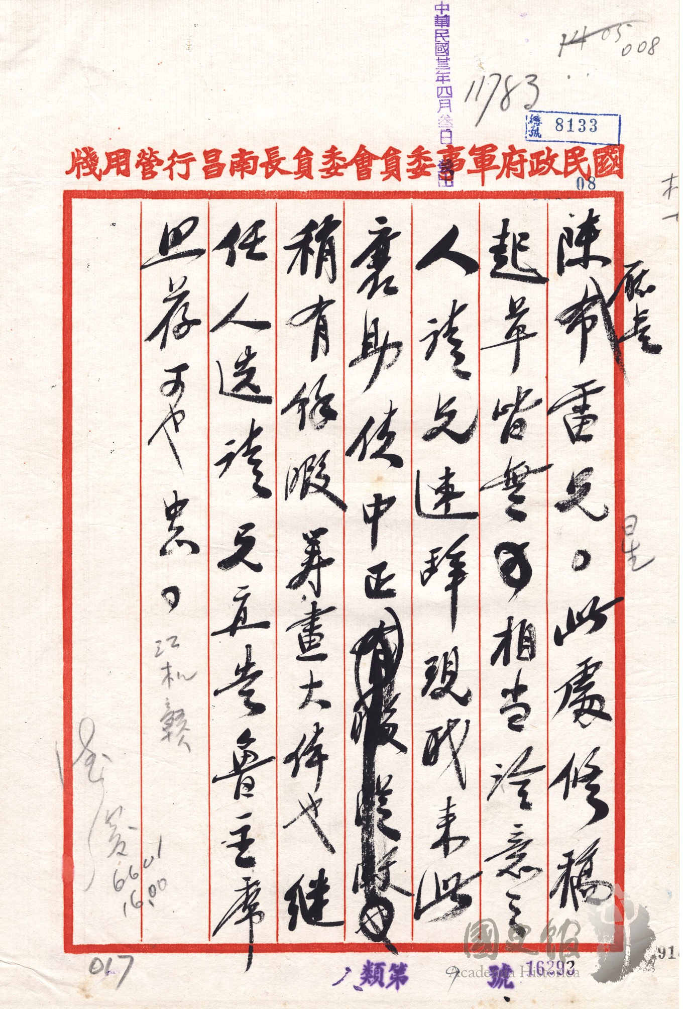 蔣中正電陳布雷請辭現職來此襄助修稿起草繼任人選直告魯滌平照薦