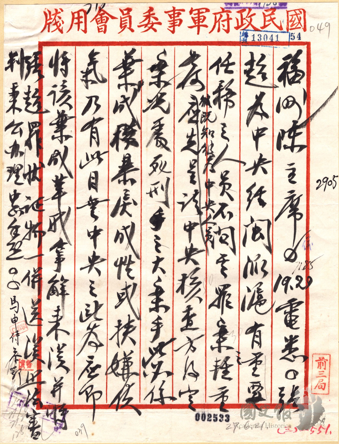 蔣中正電飭陳儀以葉成目無中央應即革職解漢並將張超送漢依法審判