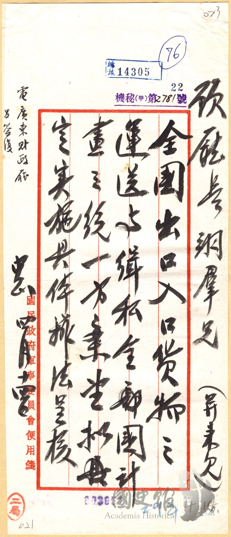 蔣中正電示顧翊群擬定全國出入口貨物運送與緝私之具體辦法