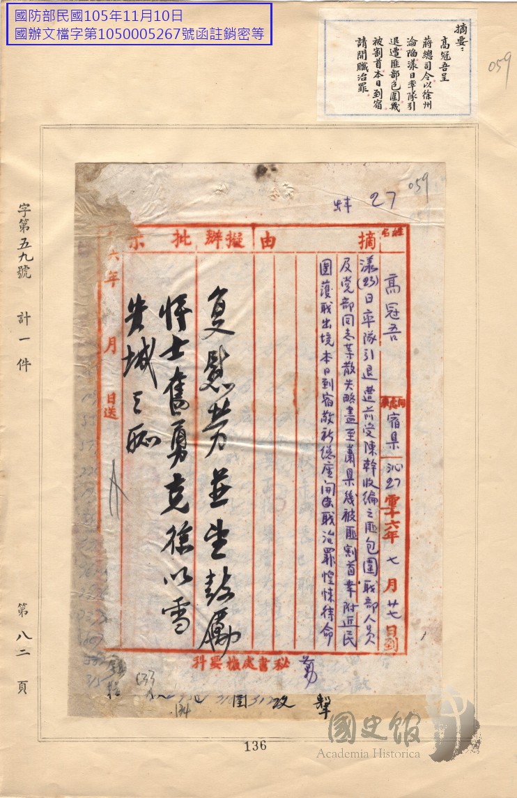 高冠吾電蔣中正徐州淪陷率隊引退遭受匪部包圍敬祈開職治罪
