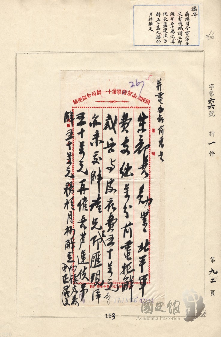 蔣中正電宋子文等即匯平五十萬元再促長蘆運使另解五十萬元