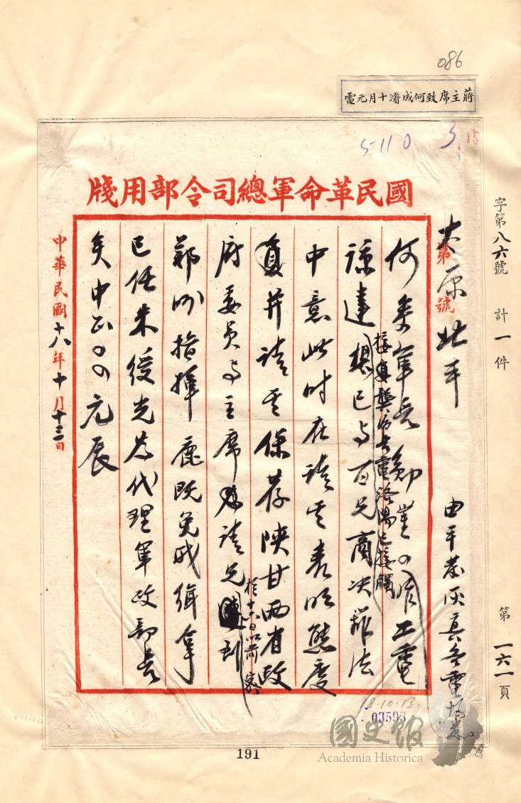 蔣中正電何成濬洛陽已接觸想已與閻錫山商決辦法已任朱綬光代理軍政部長
