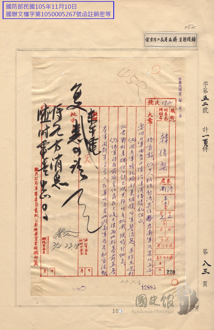 韓復榘電蔣中正據報日軍將由青島上陸沿津浦線擾亂阻止我南軍北上