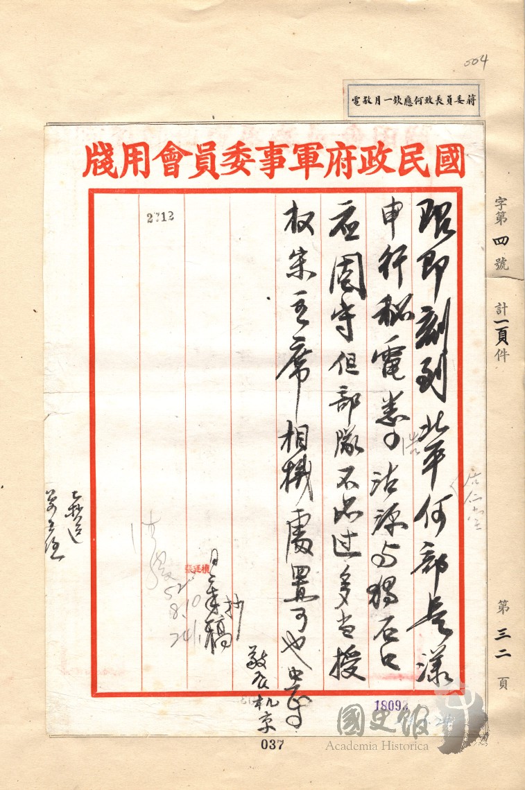 蔣中正電何應欽沽源與獨石口應固守部隊多寡授權宋哲元相機處置