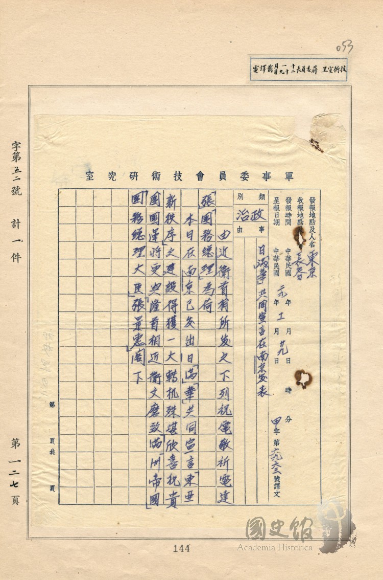 技術室呈蔣中正日滿華共同宣言本日已在南京發表
