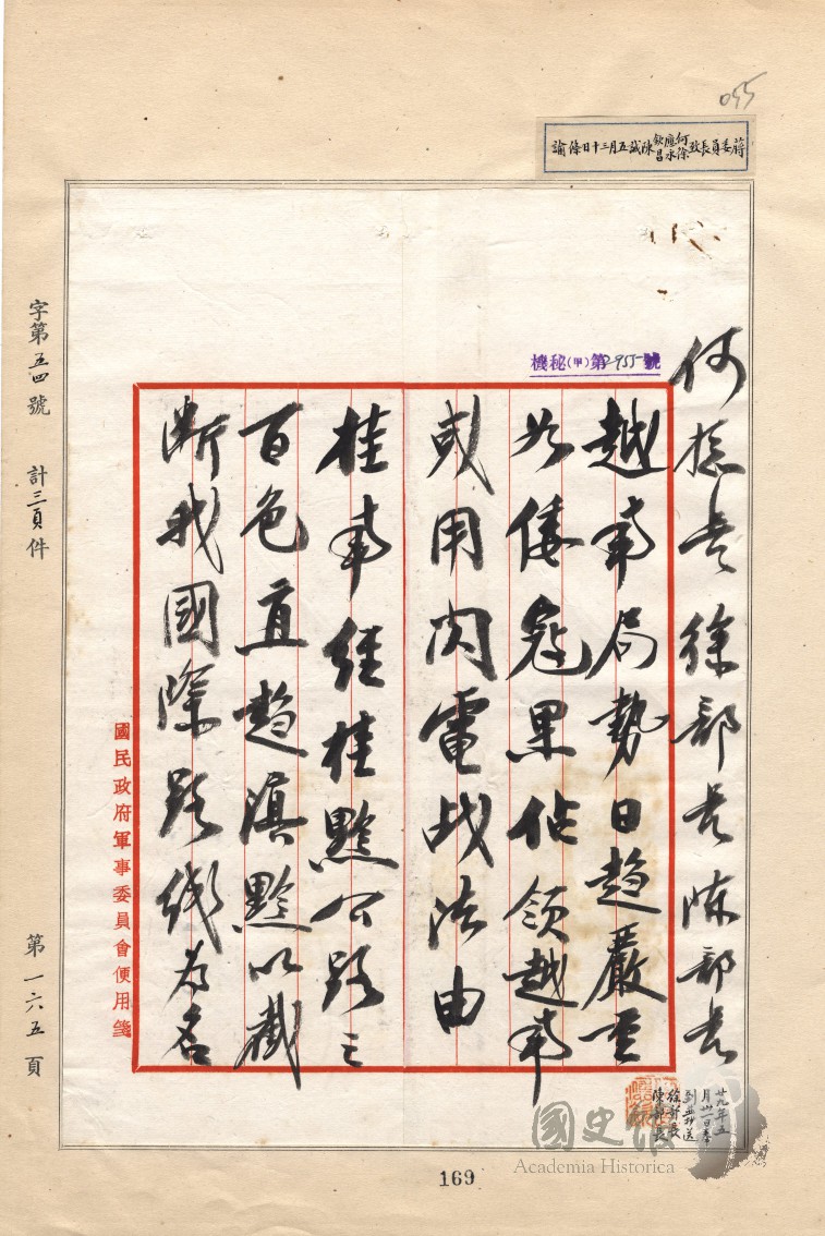 蔣中正條諭何應欽等越南局勢嚴重準備十個師以上兵力集結貴州附近
