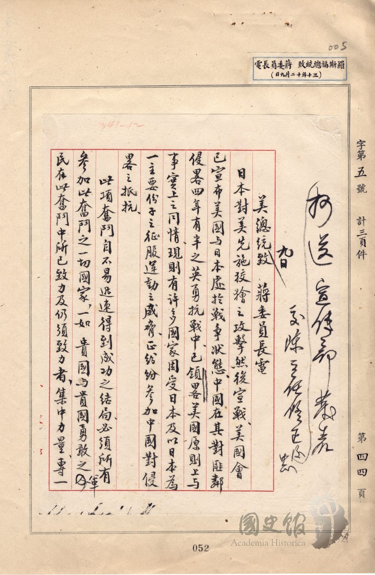 羅斯福電蔣中正美國將與其他英勇國家共同奮鬥必消滅非法勢力