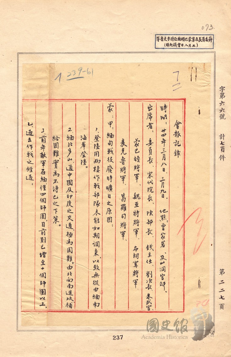 蔣中正召集蒙巴頓等對緬甸局勢檢討作戰計畫等會報紀錄