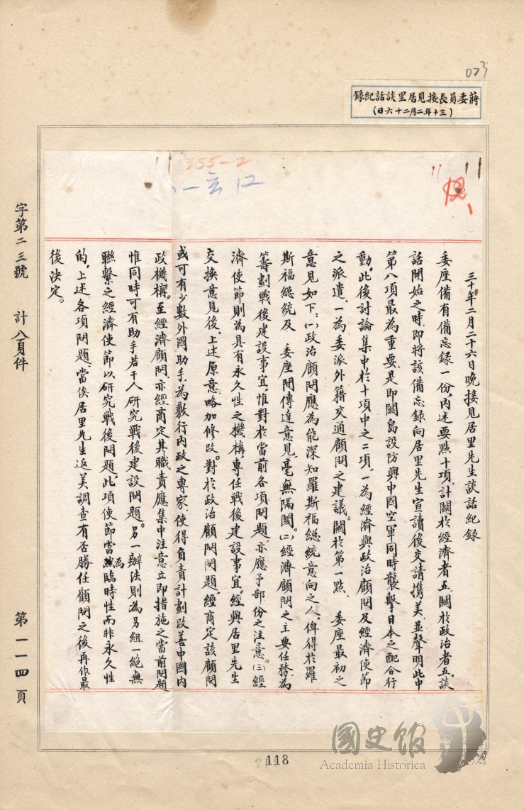 蔣中正與居里談話紀錄:商討攜美備忘錄內容等