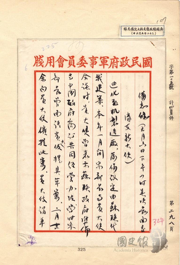 吳國楨致潘友新備忘錄:希望蘇俄能將飛機廠及油礦機件價讓